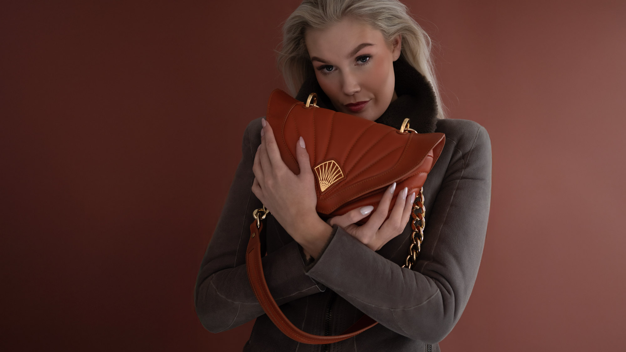A beautiful blond female model featuring the iconic Frida bag and wearing goat fur jacket with sleeves and body in leather-all by Daniele Bardis
